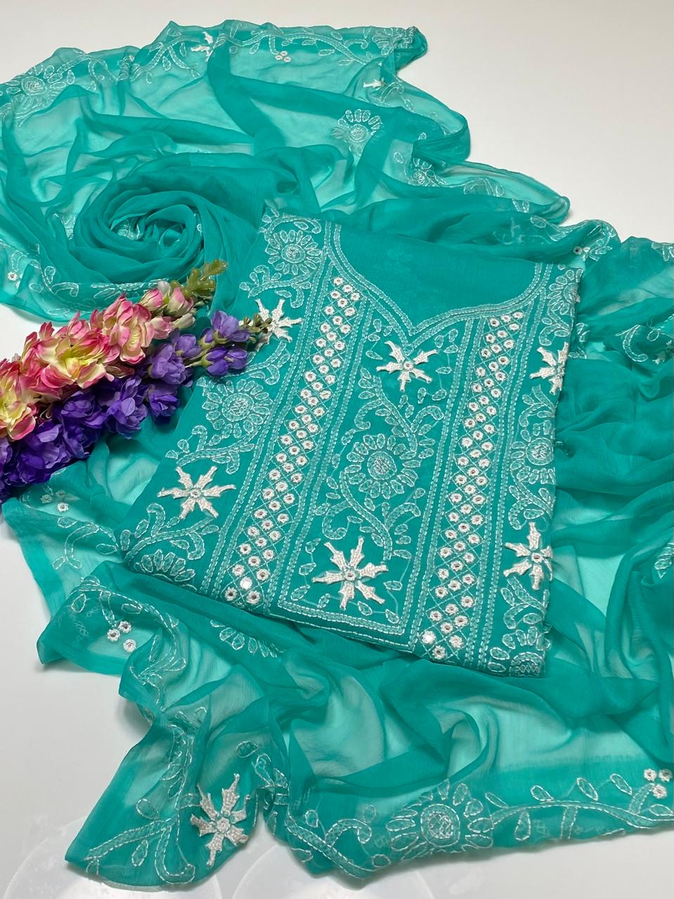 Step into elegance with this Luxury Mirror Work Organza Unstitched Suit in a captivating teal green shade. The premium organza fabric is enhanced with intricate mirror work and delicate floral embellishments, reflecting light beautifully and adding a touch of glamour to your ensemble.