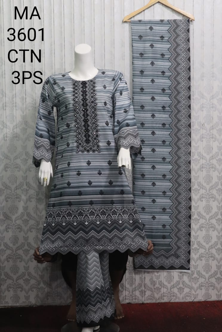 Elevate your everyday style with the MA-3601 Cotton 3-Piece Suit, crafted from premium cotton for all-day comfort and durability. This elegant ensemble comes in a sophisticated grey base with black embroidery and printed detailing, perfect for both casual and semi-formal wear.