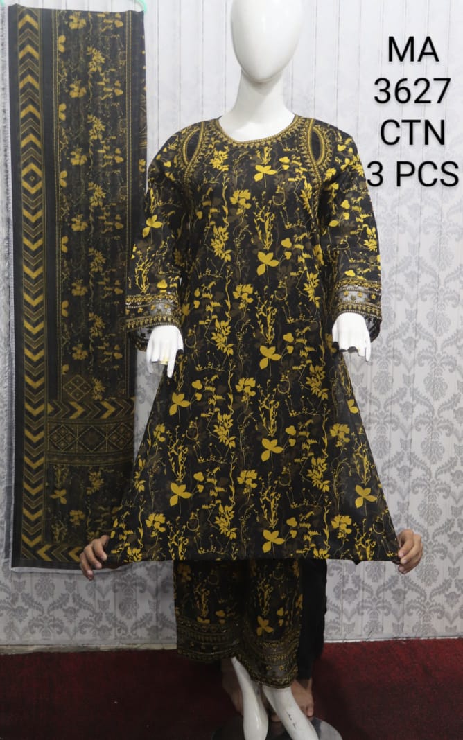 Bring timeless elegance and modern charm to your wardrobe with this beautifully crafted 3-piece cotton suit (MA-3627). Designed with a deep black base highlighted by golden floral prints, this outfit perfectly combines tradition with contemporary fashion, making it a must-have for every woman who loves comfort with style.
